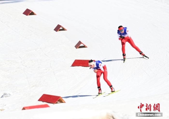 3月8日,中國選手郭雨潔(左)與中國選手李慧玲(右)在比賽中。當日,北京2022年冬殘奧會殘奧冬季兩項女子中距離-站姿比賽在位于張家口賽區的國家冬季兩項中心舉行。 中新社記者 韓冰 攝