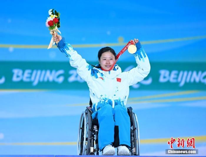 3月6日晚間,北京2022年冬殘奧會殘奧越野滑雪女子長距離-坐姿項目頒獎儀式在張家口頒獎廣場舉行,中國選手楊洪瓊獲得金牌。圖為楊洪瓊展示金牌。 中新社記者 侯宇 攝