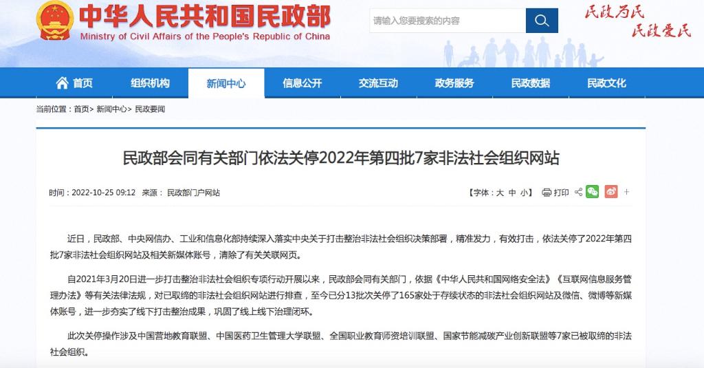 記者25日從民政部獲悉,民政部、中央網信辦、工業和信息化部近日依法關停了中國醫藥衛生管理大學聯盟等2022年第四批7家非法社會組織網站及相關新媒體賬號,清除了有關關聯網頁。