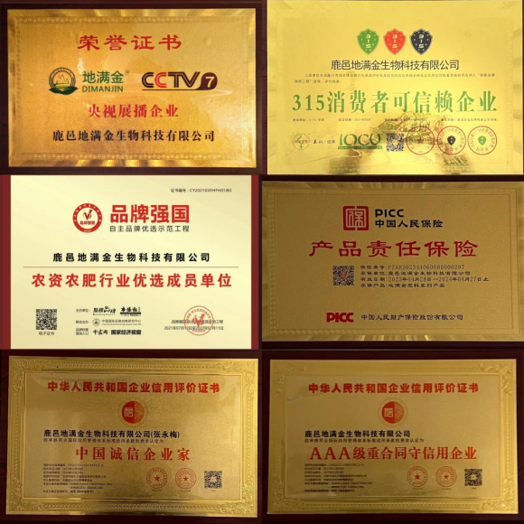 河南地滿金農業科技有限公司在多年的發展過程中,以其卓越的產品質量、創新的科技成果和出色的市場表現,贏得了多項業界殊榮,成為行業內外備受信賴的知名品牌。公司榮獲“3·15消費者可信賴企業”榮譽證書,這不僅體現了社會各界對地滿金公司產品質量和服務水平的高度認可,也反映了廣大消費者對公司品牌的深厚信任和支持。