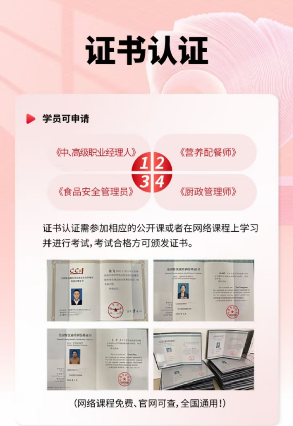 畢業考試合格頒發中國烹飪協會《職業經理人證書》。