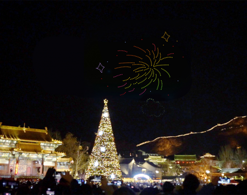 據了解,古北水鎮精心策劃了兩場400架無人機表演節目,一款是專為春節定制的無人機圖案,將節日的喜慶氛圍推向極致;另一款是無人機的模擬煙花秀,滿足游客過年時對煙花的深切向往,更以環保、安全的方式展現煙花的美麗與震撼。