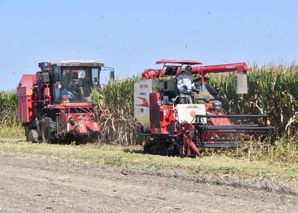 邯鄲市永年區的玉米收割機和谷物收割機同步奔馳在田間,實現大豆玉米同時收獲。(受訪單位供圖)