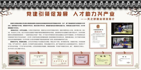 誠信為正,久久為功。安徽天之驕鵝業有限公司自成立以來,先后獲得滁州市科技局和安徽省科技廳的項目立項;于2019年加入中國畜牧業協會鵝業工作委員會,當選為協會副秘書長單位,同年獲得農業農村部頒發的中華神農獎;于2021年,成功入選CCTV-17《致富經》欄目,這是天之驕鵝業在品牌建設道路上的一個里程碑,將對公司建立更加科學有效的品牌管理體系,提升質量品牌管理水平和效益產生積極而深遠地影響,也必將有力助推公司以品牌引領走向更加自信的高質量發展之路。