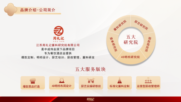 周禮記全稱為“江蘇周禮記醬料研究院有限公司”,是餐飲酒店業的產品研發基地,專為餐飲酒店業提供醬料、菜品研發和培訓服務。并開設高級廚藝實操...【詳情】