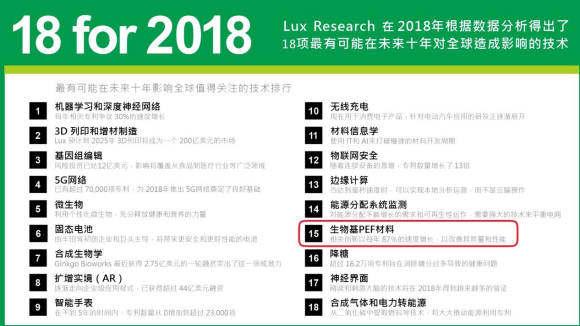 據美國技術傳新研究與咨詢機構Lux Research在2018年根據數據分析得出了18項最有可能在未來十年對全球造成顛覆性影響的技術,其中GTI的生物基PEF材料就是這18項核心技術其中之一。呋喃二甲酸聚酯乙二醇不僅提升了產品的穩定性,還通過其生物降解特性減少了廢棄物對環境的長期影響。這種材料的應用標志著公司在技術領域的創新精神和對環保的堅定承諾。