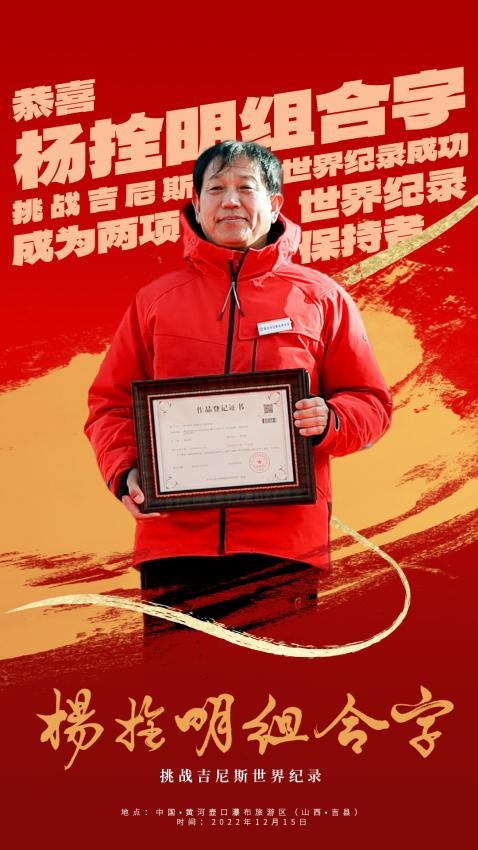 中國新媒體信息網訊(曉嘉) 人因夢想而偉大。雖然我們每一個人不一定真正會因為自己夢想的實現,就變成一個偉大的人,但毋庸置疑的是,夢想——是成就心中的英雄,讓人生變得更有意義充分且必要的條件。繼2019年6月23日,楊拴明以毛筆書寫一筆空心字成功挑戰吉尼斯世界紀錄之后,12月15日,“楊拴明組合字”在黃河壺口瀑布、在母親河的見證下,在海內外全網數以億計的觀眾關注下,再一次成功挑戰吉尼斯世界紀錄,至此成為了兩項吉尼斯世界紀錄的締造者。