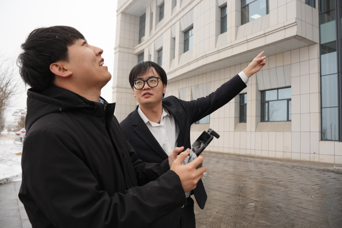 在榆北信息化運維分公司辦公樓前,小保當智維中心員工宋斌瑞站在高空攝像頭下,認真地講解著無人機的環繞飛行控制方法,一旁站著操作無人機的是網絡技術骨干付磊。