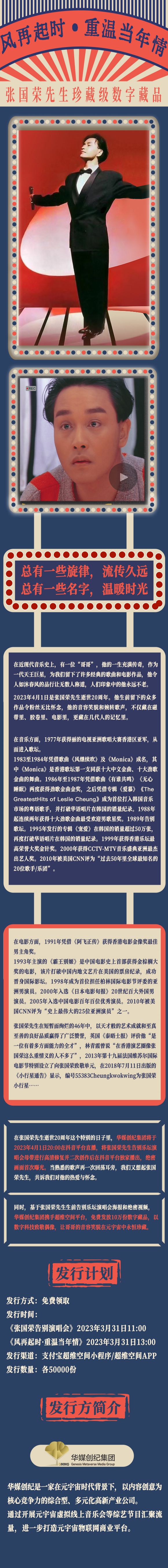 同時,基于張國榮先生生前告別樂壇演唱會海報和絕密視頻,華媒創紀集團攜手超維空間平臺,面向全球粉絲免費發放10萬份數字藏品,以數字科技致敬偶像,讓哥哥的音容笑貌在元宇宙中永恒珍藏。